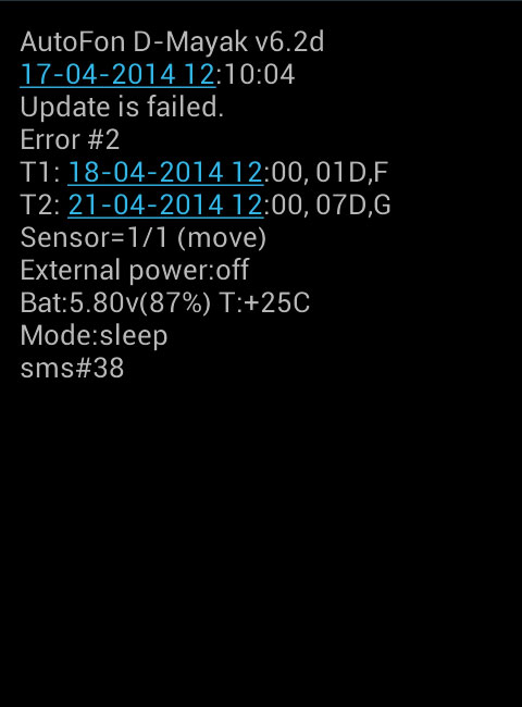 Через сайт МТС подключена опция GPRS (была выключена), работоспособность интернет-трафика у данной симки проверена на смартфоне. Баланс счета на текущий момент около 200 руб. Тем не менее неоднократные попытки обновить прошивку (через АвтоФон Коммандер) на версию F заканчиваются сообщением маяка "Update is failed. Error #2". В чем может быть проблема???