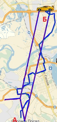 Я поехал где начинается "Сергиев посад" и по карте вверх до улицы О.Кошевого. Остальные длинные прямые линии это вообще что ? там даже видно где я реально ехал по дорогам, а остальное как на вертолете :))