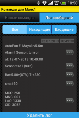 При включенном датчике переворота и передаче координат по тревожным событиям, маяк передает сообщение о перевороте на оба номера и координаты только на второй номер.