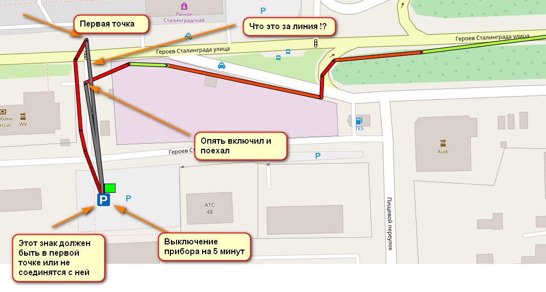 2) Если включить алгоритм "антизвезы + детекция движения" и ехать в пробке или по серпантинами выше 85км.ч - то точки могут идти в нахлёст. Я по телефону эту проблему сообщал. Незнаю пофиксили или нет.